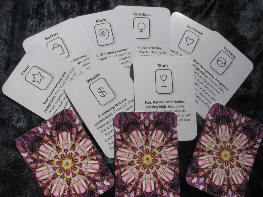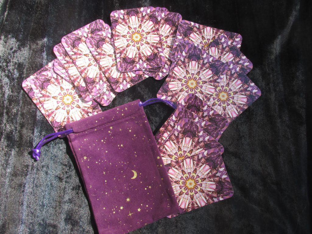 The cards are a set of 26 2.5″ by 3.5″ cards that come in a small velvet bag, for $13.00