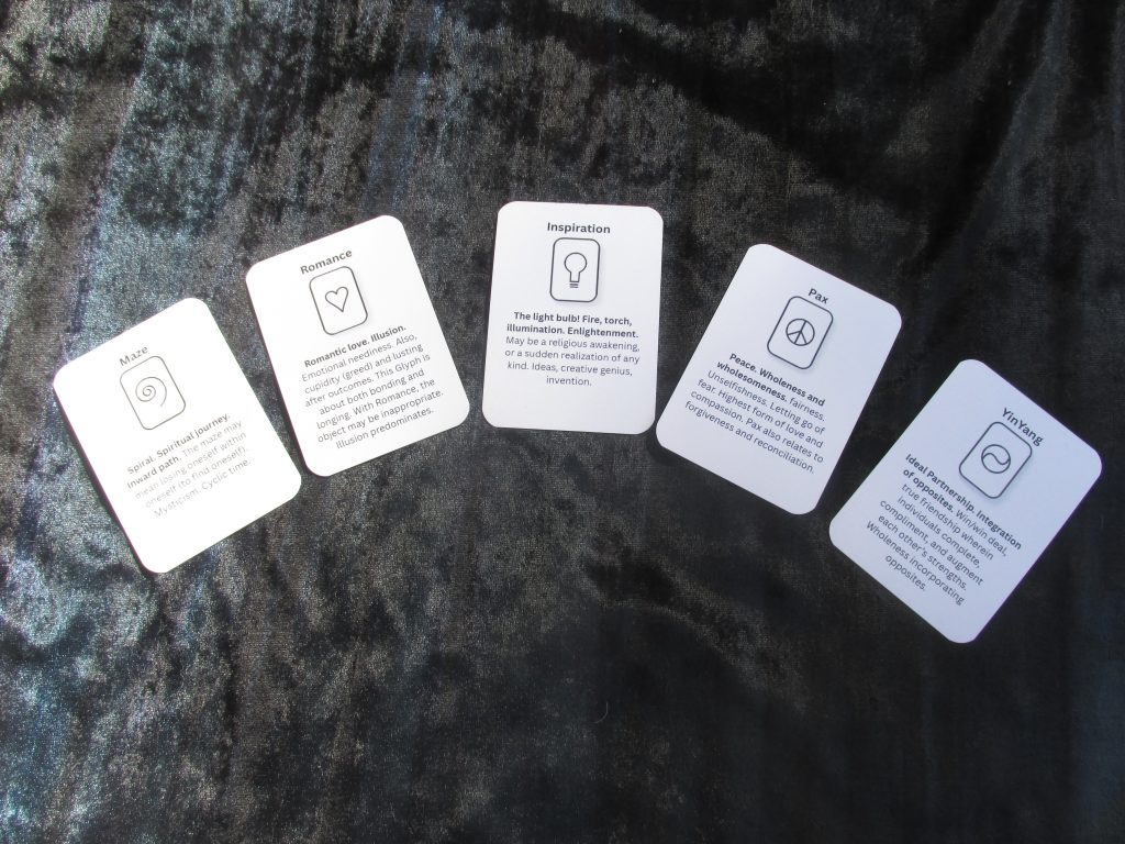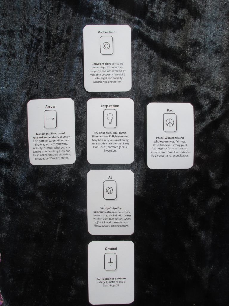 There are several ways of using cards to look for insights. Here is just one of the methods shown in an introductory booklet. There are simpler ways to read the cards, in ways that make sense to you, as well as more complex ways of laying them out.
